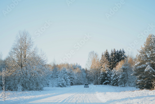 A winter road through a snow-covered forest with a passing car, road signs, surface of snow and ice