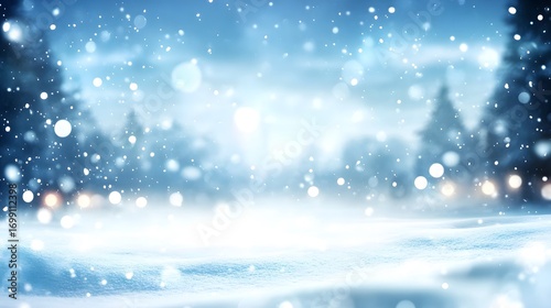 A winter scene of falling snow against a backdrop of softly lit trees, showcasing a serene and peaceful atmosphere.
