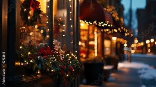 A winter street adorned with festive lights and decorations, creating a cozy holiday atmosphere in a snowy setting.