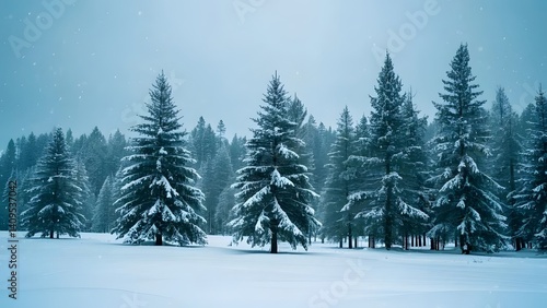 A winter wonderland scene with snow-covered pine trees, soft falling snowflakes, muted color tones, peaceful atmosphere, wide shot capturing the stillness of the season.