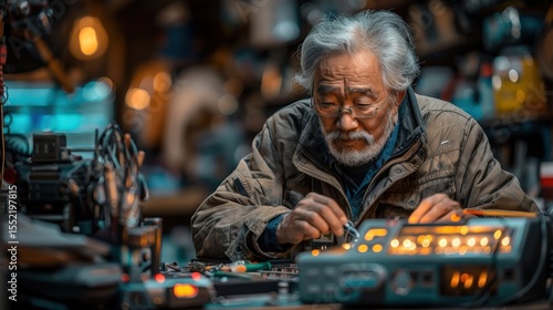 A wise, elderly Asian man with gray hair and a beard meticulously works on an electronic device at his cluttered workbench. The warm, soft lighting of the workshop highlights his deep concentration an