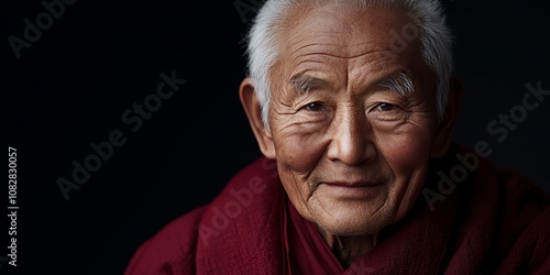 A Wise Elderly Man in Traditional Robes Smiles Warmly Against a Dark Background, Capturing a Moment of Serenity and Wisdom