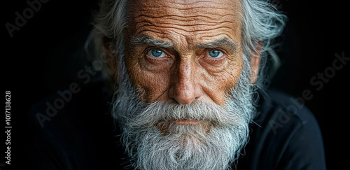 A wise-looking elderly man with a flowing white beard gazes directly, showcasing deep lines of experience and vibrant blue eyes.
