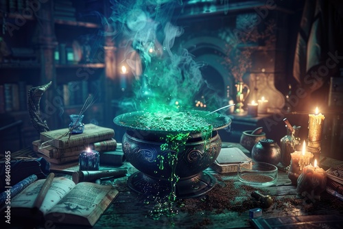 A witch's cauldron filled with a bubbling green potion, surrounded by spellbooks, candles, and various magical ingredients in a dark, cluttered room