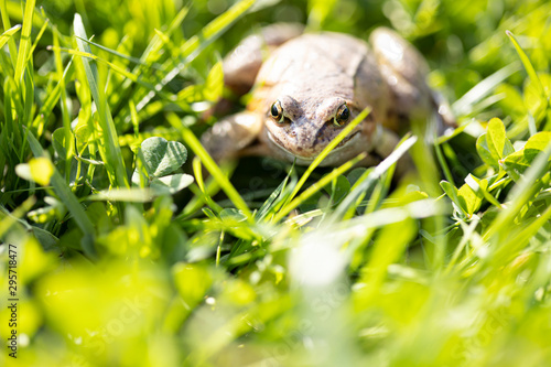 A witty frog sits on the grass under the rays of the sun. Swamp frog close-up.