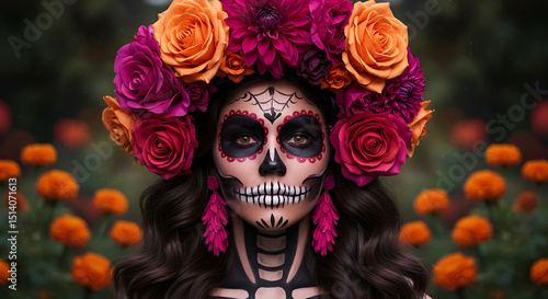 A woman adorned with vibrant floral headwear and intricate sugar skull makeup poses gracefully against a blurred backdrop of marigolds, celebrating Dia de los Muertos.