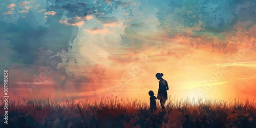 A woman and a child are walking in a field at sunset. The sky is filled with clouds and the sun is setting, creating a warm and peaceful atmosphere