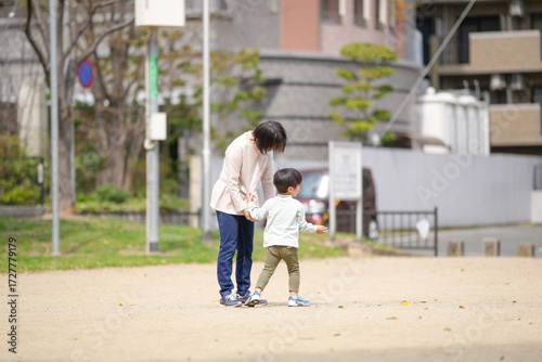 A woman and a child are walking together in a park. The woman is holding the child's hand