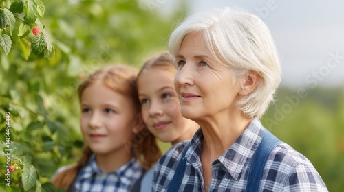 A woman and two girls admire raspberry plants in a lively, green setting, highlighting family connections and nature's beauty.