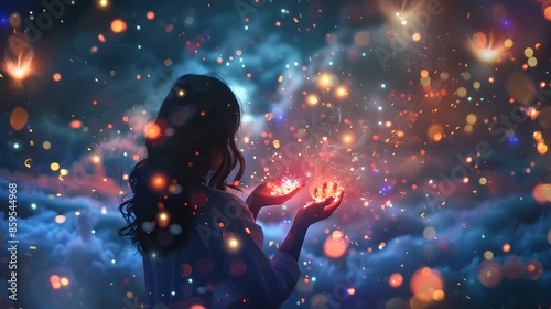 A woman at a Christmas night club surrounded by abstract winter elements like stars, snow, and a magical moon, with a festive and fantastical atmosphere