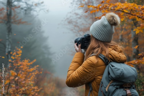 A woman, bundled in a cozy winter coat, captures the mystical beauty of the foggy autumn forest through her lens