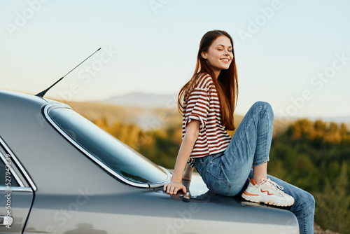 A woman car driver sits on the trunk of a car and smiles admiring a beautiful view of autumn nature and mountains