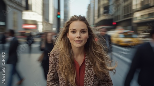 A woman confidently strides through a bustling city street, vibrant life and motion surrounding her in a vivid urban tapestry.