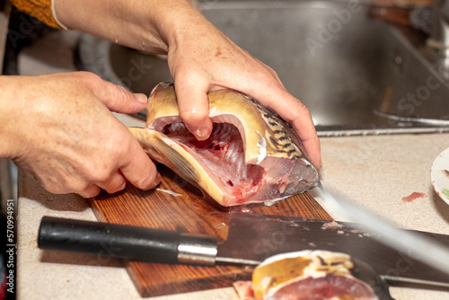 A woman cooks fish at home in the kitchen
