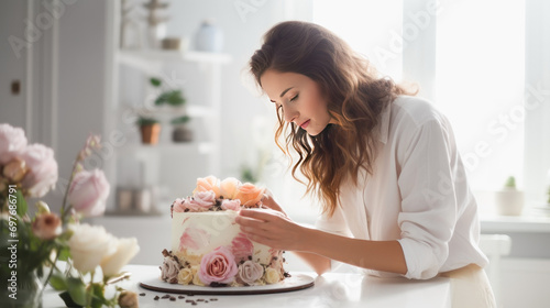 a woman decorates a cake with cream in the form of roses
