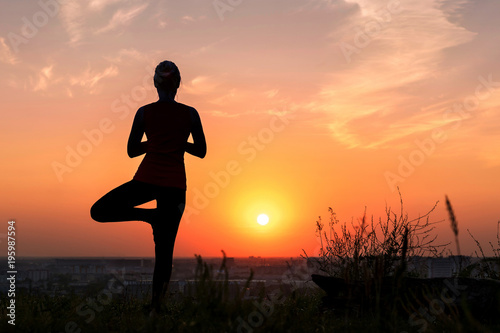 A woman does yoga in nature. Silhouette in sunset. tree pose Vrikshasana