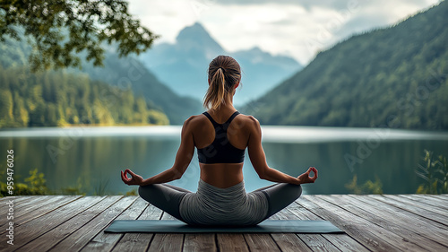 A woman doing a yoga pose on a wooden deck overlooking a peaceful lake with mountains in the background