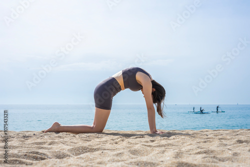 a woman doing yoga on the beach in front of the ocean. Cat pose. Copy space.