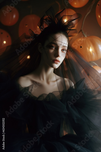 A woman dressed in a fashionable black dress stands among a field of orange pumpkins, a halloween doll in hand, ready to embrace the spirit of the season