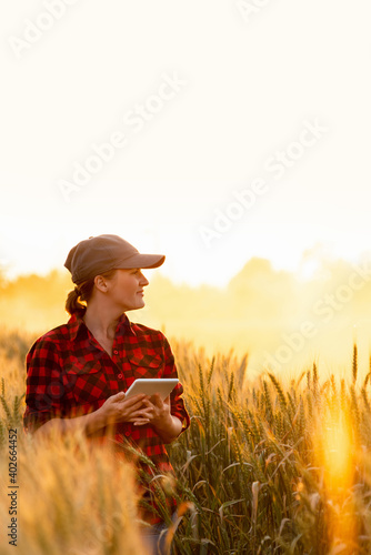 A woman farmer examines the field of cereals and sends data to the cloud from the tablet. Smart farming and digital agriculture.