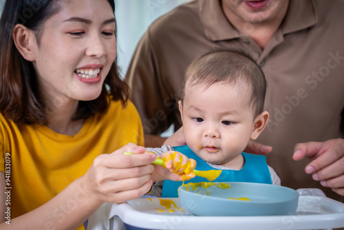 A woman feeds a baby in a high chair. The baby is wearing a bib and is eating food. The scene is warm and loving, with the woman and baby sharing a special moment together
