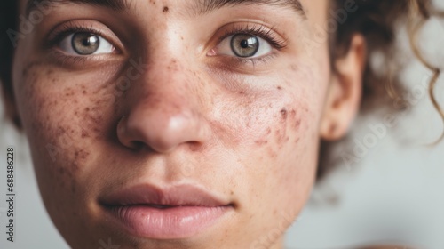 A woman from Europe confidently looks at the camera, embracing her flawed skin against a beige backdrop.