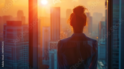 A woman gazes at a vibrant sunset over a city skyline, evoking a mood of contemplation and solitude.