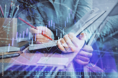 A woman hands writing information about stock market in notepad. Forex chart holograms in front. Concept of research. Multi exposure