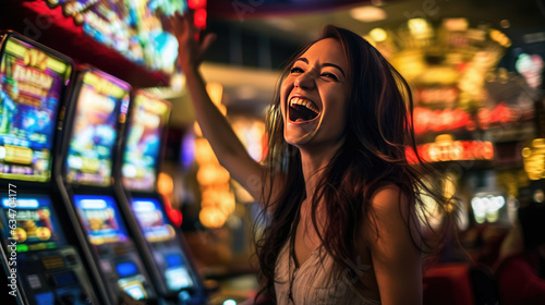 A woman happily celebrates her jackpot win on a slot machine in a casino