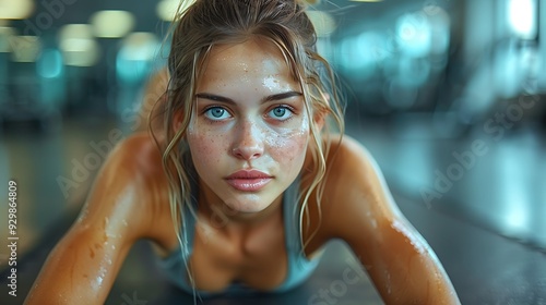 A woman holding a plank position in a modern gym. her muscle definition and stability evident. sleek gym interior with mirrors and clean lines. strong directional lighting. hd quality. natural look.