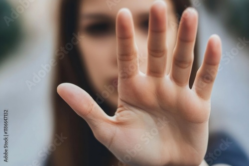 A woman holding her hand up in the air, possibly in a gesture of surrender or supplication