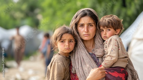 A woman holds her young son while standing beside her daughter in a refugee camp, showcasing their resilience amid difficult circumstances