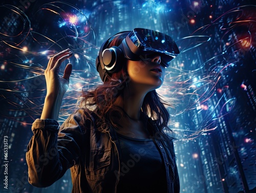 A woman immersed in a vibrant digital world, wearing a virtual reality headset, with dynamic lights and patterns surrounding her.