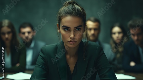 A woman in a dark green blazer, with her hair pulled back in a sleek bun, stands at the head of the table, her face filled with determination as she leads a brainstorming session. Her colleagues