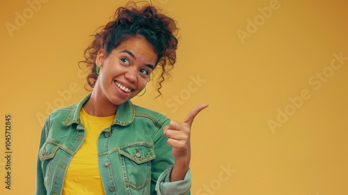 A woman in a green jacket gestures towards the camera, alert and focused