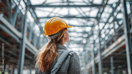 A woman in a hard hat examines a construction site, showcasing determination and the spirit of modern engineering.