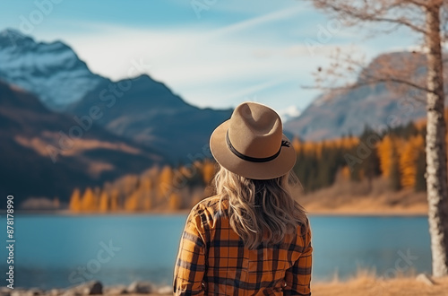 A woman in a hat and plaid shirt overlooks a scenic lake with autumn foliage and mountain peaks in the distance