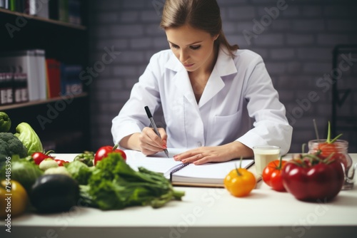 A woman in a lab coat writing on a notebook. Ideal for scientific and research concepts