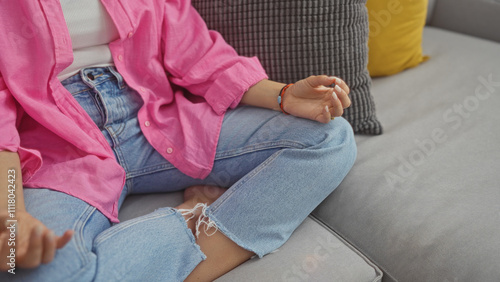 A woman in a pink shirt and jeans sits cross-legged on a sofa in a cozy living room with her hands resting on her knees in a meditative pose.