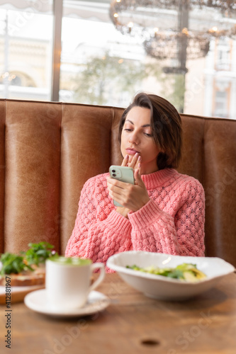 A woman in a restaurant in a warm sweater is looking at something on the phone, a delicious healthy breakfast and matcha latte on the table