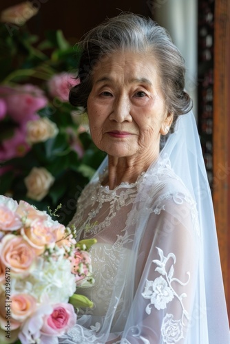 A woman in a wedding dress holding a bouquet of flowers. Suitable for wedding or bridal concept