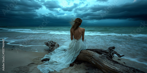 A woman in a white dress sits on a driftwood log by the sea, sitting on beach