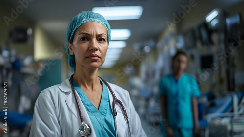 A woman in a white medical gown and a blue cap stands in a hospital hallway