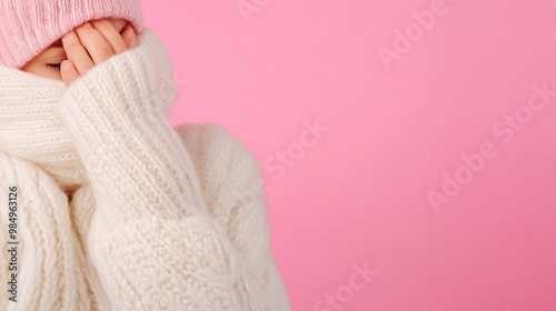 A woman in a white sweater covering her face with both hands, AI