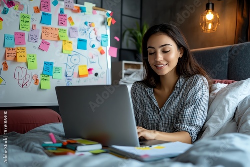 A woman in bed working with her laptop, surrounded by colorful sticky notes and a whiteboard with project ideas