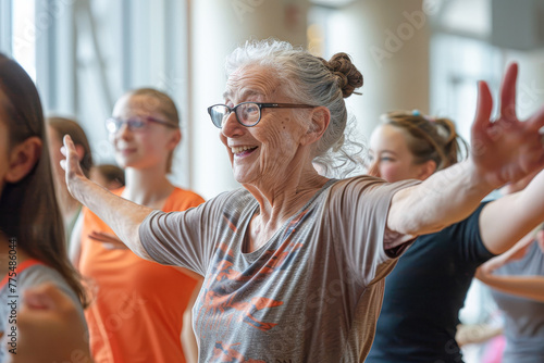 A woman in glasses and a gray shirt is smiling while dancing with other people. Scene is joyful and lively