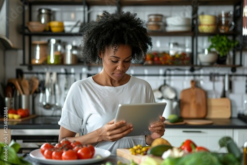 A Woman in kitchen looking at recipe on tablet
