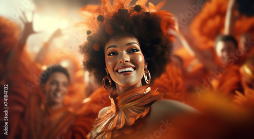 a woman in orange standing up and dancing with a group of others