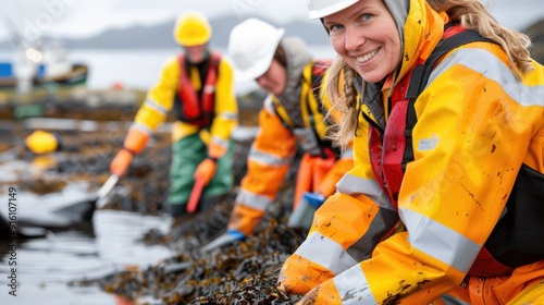 A woman in safety gear and raincoat smiles while participating in a seaweed cleanup effort on a rugged shoreline with other workers in the background, representing environmental care.