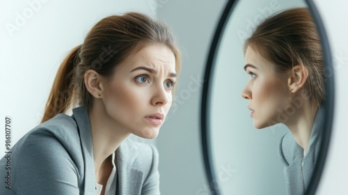 A woman, insecure and unsure, gazes at her reflection, filled with doubt about her management role, haunted by impostor syndrome generate by AI